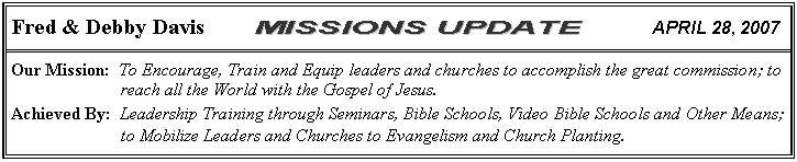 Debby and Hannah joined Fred for the seminar.  In the mornings Fred spoke to leaders about prophecy in the Bible.  Debby spoke in the evening about covenant.  They received so much and asked us to do the seminar again so that more leaders could come hear it.  In the evening Fred went to a Video Bible School and did some “live” teaching and another night he went with Bill Hoffman to speak to the church leaders in the village before Bill spoke to everyone.