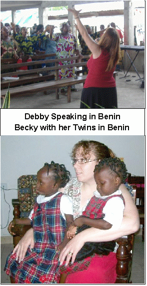 The trip was difficult from the beginning. Becky Flitcroft lost some of her luggage on the flights over and Debby became sick with bronchitis on the first day. Then they were unable to get the necessary adoption and travel papers, because the courts went on strike in Benin. Each time when it seemed like they’d get the papers so the twins could fly, it wouldn’t happen. After a month of trying, they had to come back to the States without the twins. The strike is still in progress. They were assured that as soon as the strike is over the girls will get their papers. We are hopeful that Fred and his team will be able to bring them to the States in October. At this time the unofficial word is that the strike may end any day or it may go on into October. Please pray with us that it will end soon and the girls will get all their papers.
