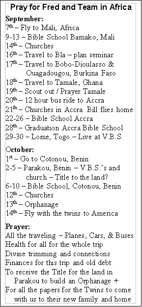 Fred is headed back to West Africa with a team on September 7th. He will be accompanied by his brother, Bob Davis, Nephew, Charlie Harrison, and Bill Chapel, who has been with Fred a number of times in the last few years. We would really appreciate it if you would hold them all up in prayer. When they return to the States, they plan to bring the twins home from Benin to Doug & Becky & family.